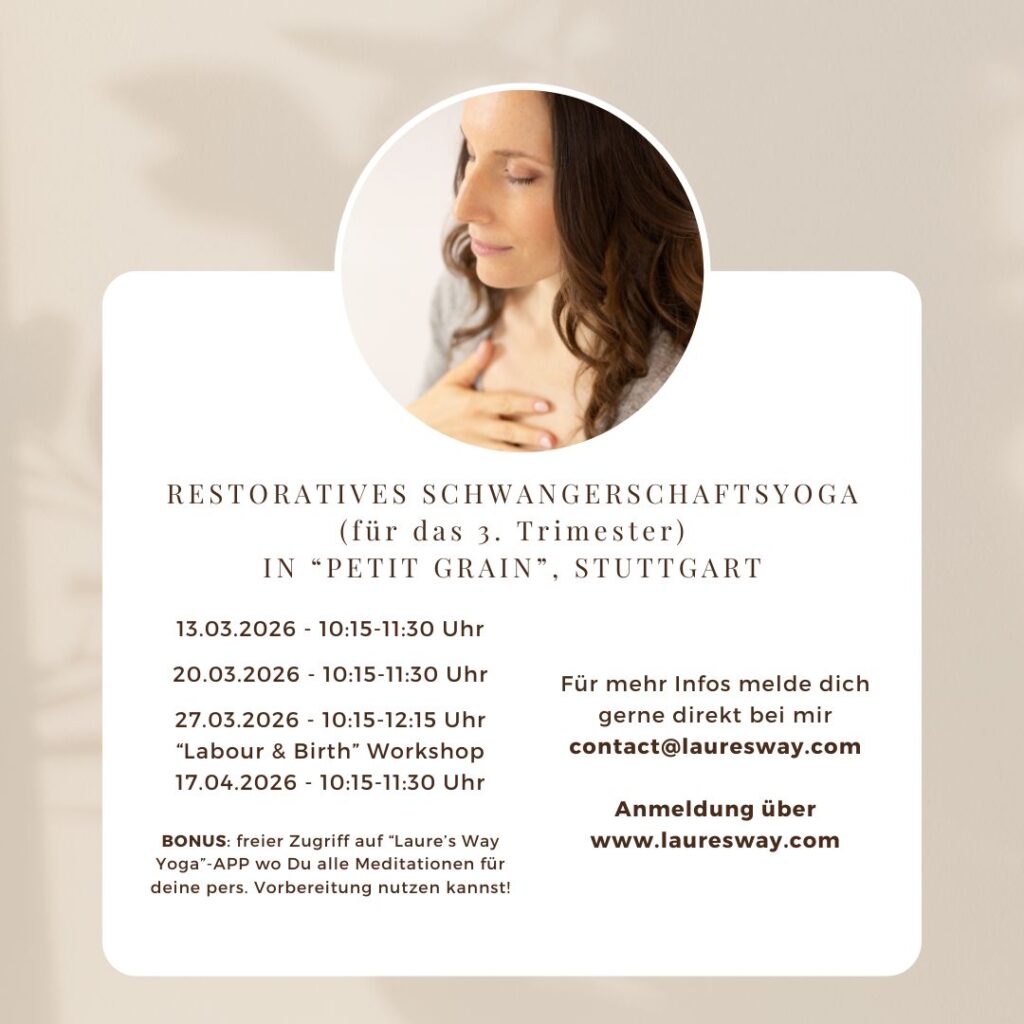 Ab dem Tag unserer ersten gemeinsamen Stunde erhältst du Zugang zur Laures Way Yoga App. Dort findest du alle Meditationen und Yoga-Nidra-Einheiten, die wir im Kurs nutzen – damit du zu Hause, zwischen den Kursstunden oder in besonderen Momenten einfach weiter entspannen, üben und dich innerlich ausrichten kannst. So begleitet dich der Kurs nicht nur in den gemeinsamen Stunden, sondern schenkt dir auch für die letzten Wochen deiner Schwangerschaft zusätzliche Ruhe und Unterstützung.